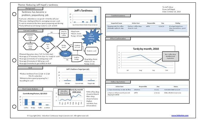 The A3-report really shines when used as a coaching tool and not a bureaucratic formality. Say you have a problem of missing bandages in the exam rooms. In the improvement meeting on Friday, Amanda volunteers for the task. This meeting is only for assigning projects, so the real work gets done during the week. Every day in the following week Amanda brings an A3-sized paper on which she writes what she has learned about the problem, what the underlying causes are and who has a stake in it’s solution. On Wednesday she tries the first experiment and updates the A3 accordingly.
