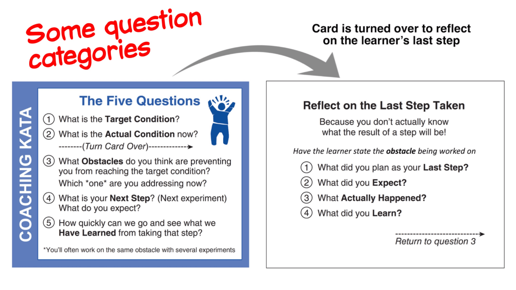 A Kata is a pattern, a repeatable but simplified set of steps, like playing scales on an instrument. In his book on the Toyota Kata, Mike Rother asks if we missed the real secret of Toyota’s success – training people to be problem-solvers, and managers to be problem-solving coaches. And the best way to learn is to practice with a structure – such as his coaching-kata questions.