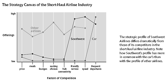 Below is an illustration of Southwest Airlines, one of the early low-fare carriers. Note how radically different its offering is from the existing airlines, with less of the traditional amenities such as meals, but more of other features such as friendly service, speed and more frequent departures. The more different your strategy, the more clearer your position will be in the eyes of customers and staff.